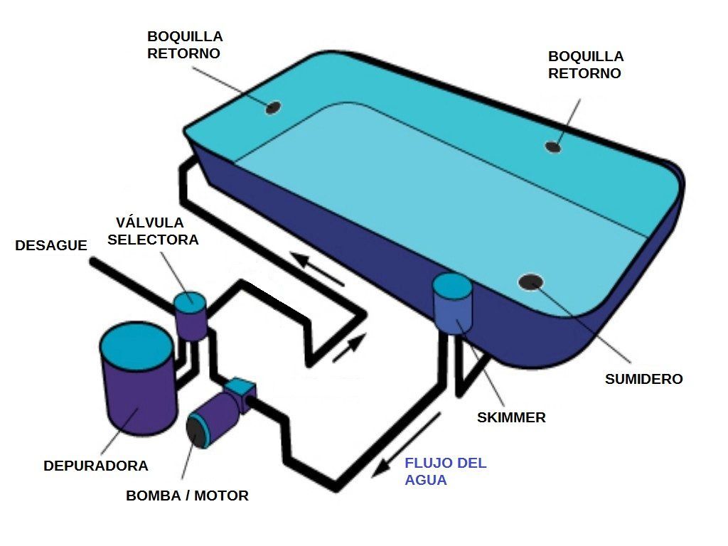 💧 La manera en como funciona la depuradora de una piscina reside en el esquema de las partes que intervienen en su funcionamiento: El skimmer, los sumideros, la bomba de agua, la depuradora, el filtro y las boquillas de retorno en los que circula el agua en forma de bucle para que ésta se mantenga limpia y desinfectada.